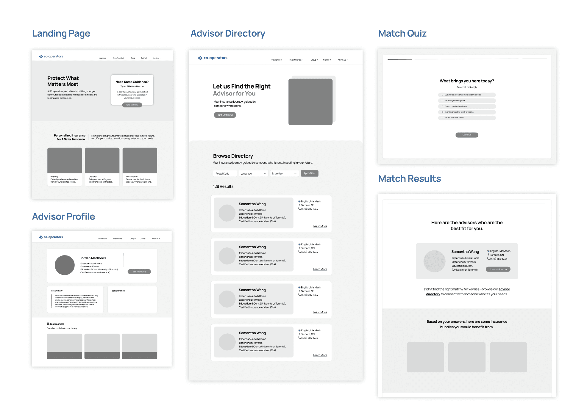 We created low-fidelity prototypes to help us refine the quiz length and determine how much advisor information to show upfront versus behind profile clicks. Early testing revealed that presenting three matched advisors with brief summaries worked better than five lengthy profiles.