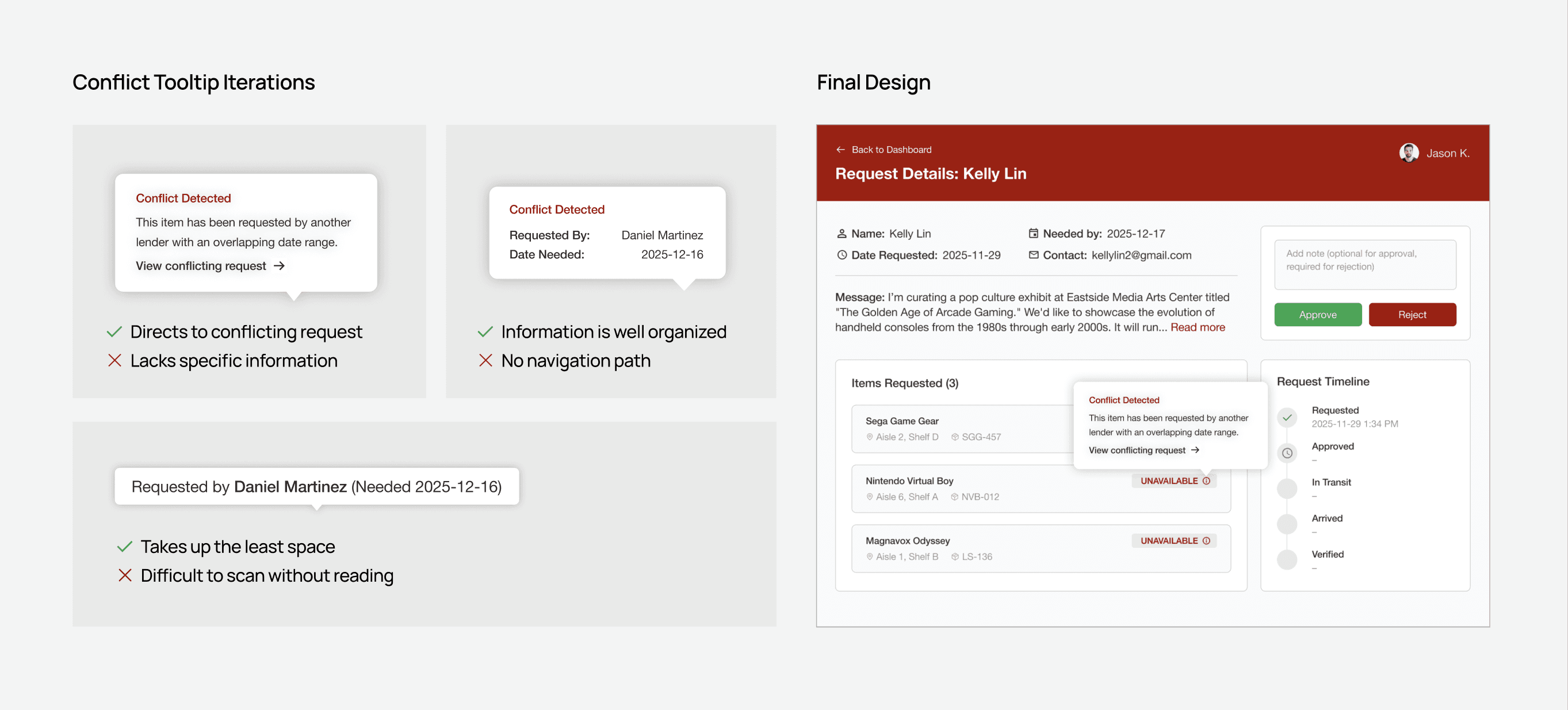I chose Iteration 1 because it focuses on the admin’s immediate next action: viewing and comparing overlapping requests. While Iterations 2 and 3 provide more context upfront, they force admins to exit the current request, return to the dashboard, and manually search for the conflicting requester.