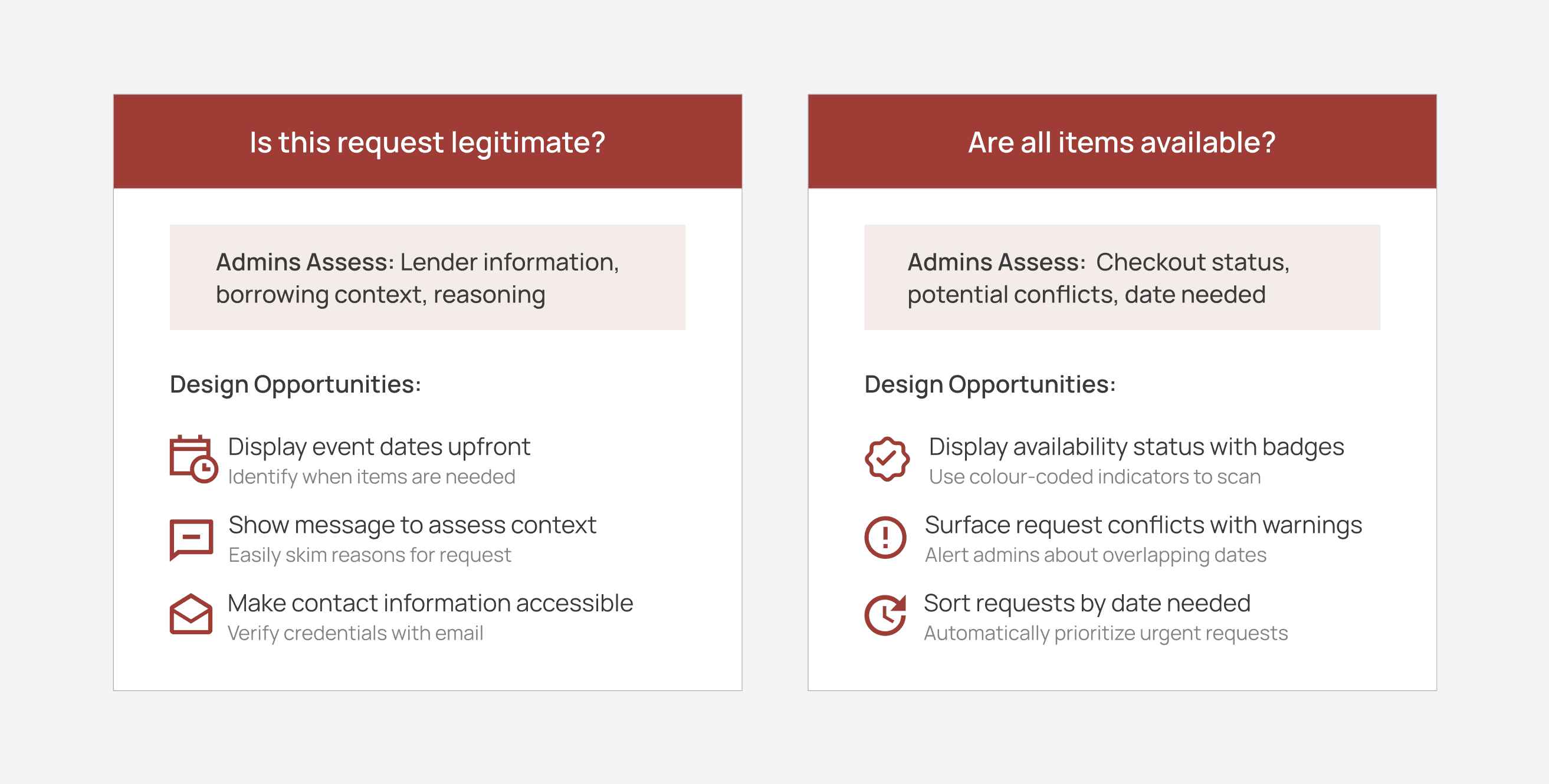Building on my UXR findings, I identified the core questions admins ask before making any approval decisions. Understanding this evaluation criteria allowed me to translate admin needs into direct design opportunities that would surface the right information at the right time.