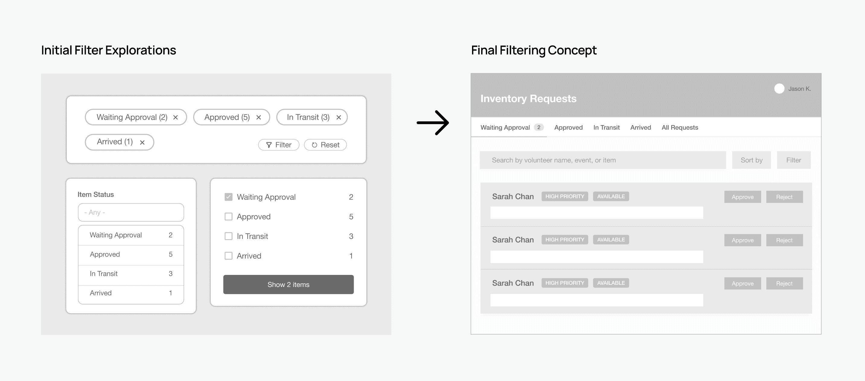 My first instinct was to explore filters to select status categories, but this approach required constant clicking to see different stages. This felt repetitive and unintuitive because it forced admins to actively choose what to view rather than giving them visibility into their complete workload. Instead, I transformed the filtering concept into persistent status tabs that mirror the physical journey of artifacts.