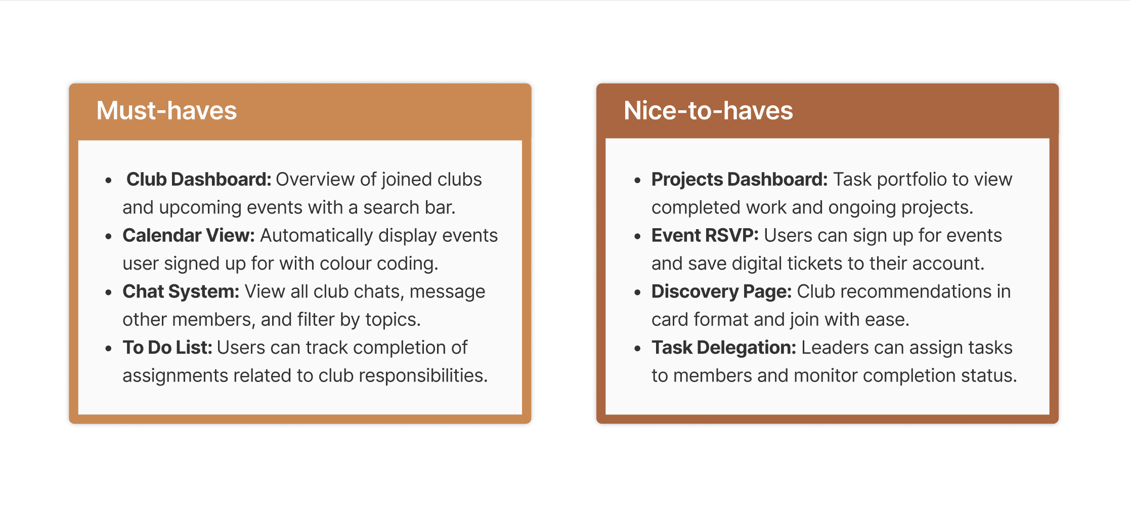 When mapping out the information architecture, we identified three key phases: discovery (finding and joining clubs), integration (new members becoming active participants), and contribution (managing tasks and joining initiatives).