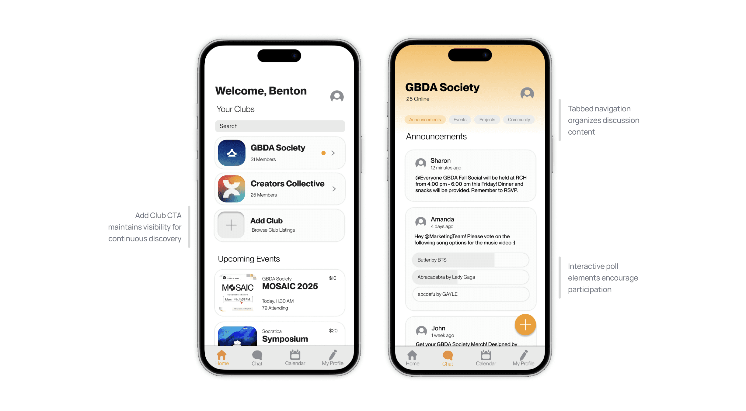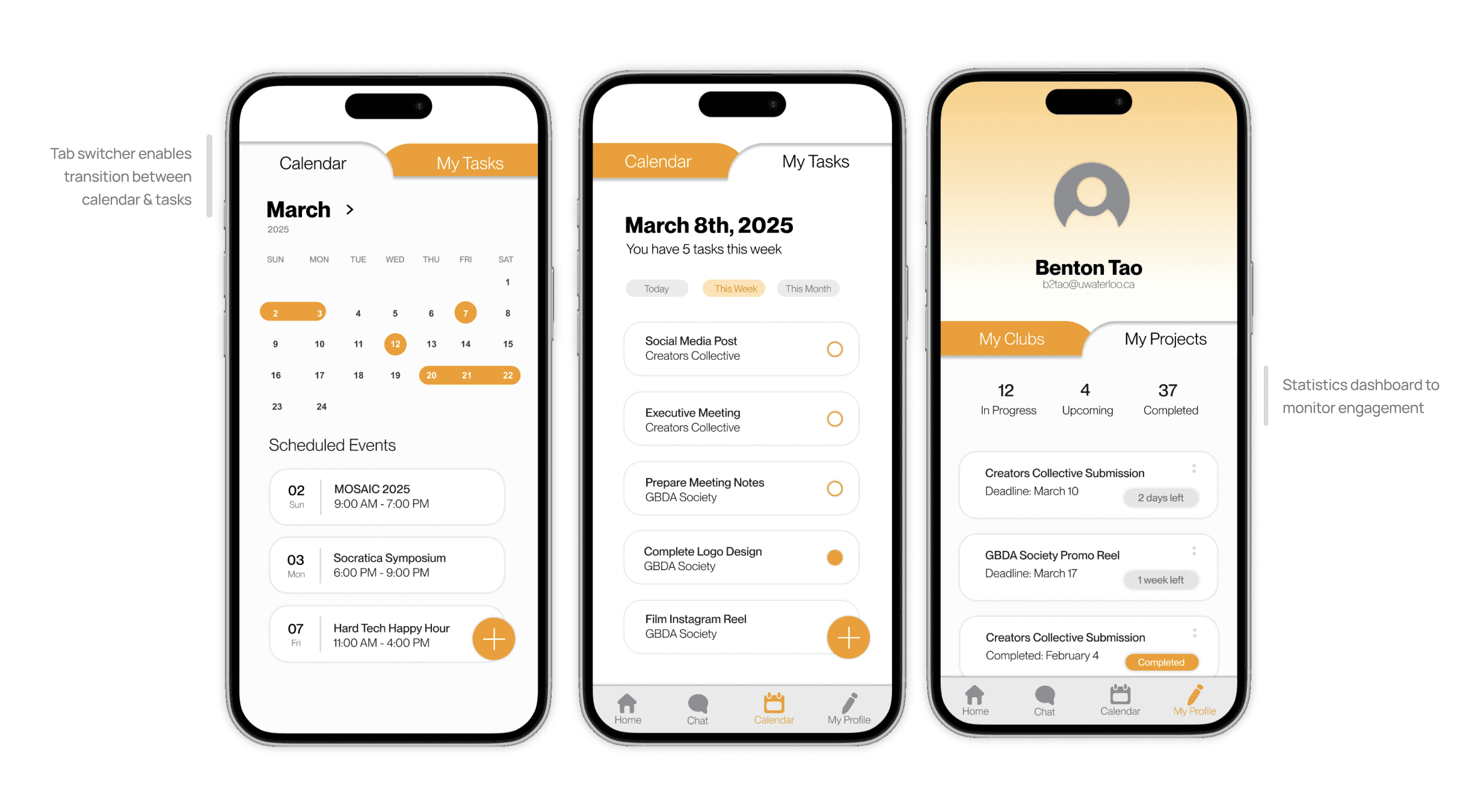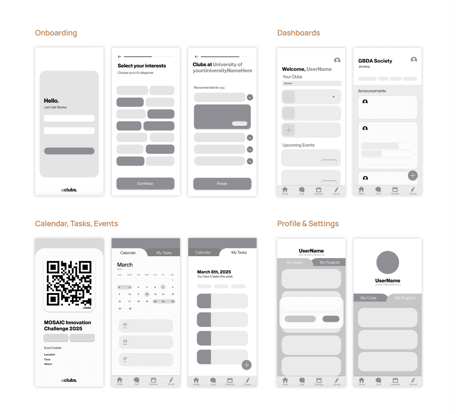 UClubs is a mobile application that streamlines the coordination of university clubs. By combining club discovery, scheduling, project management, and communication tools into one cohesive space, club leaders can build a more active and engaged community.