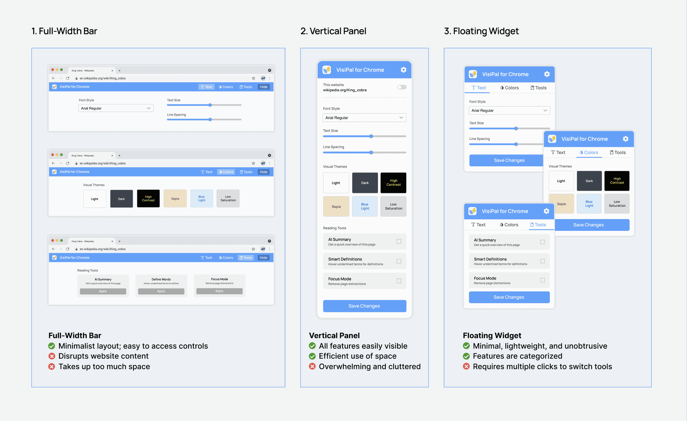 We researched different interfaces and selected three viable options: a full-width bar, a vertical panel, or a floating widget on the top right corner. Each approach offered unique advantages and trade-offs in terms of visibility, screen space, and ease of use.