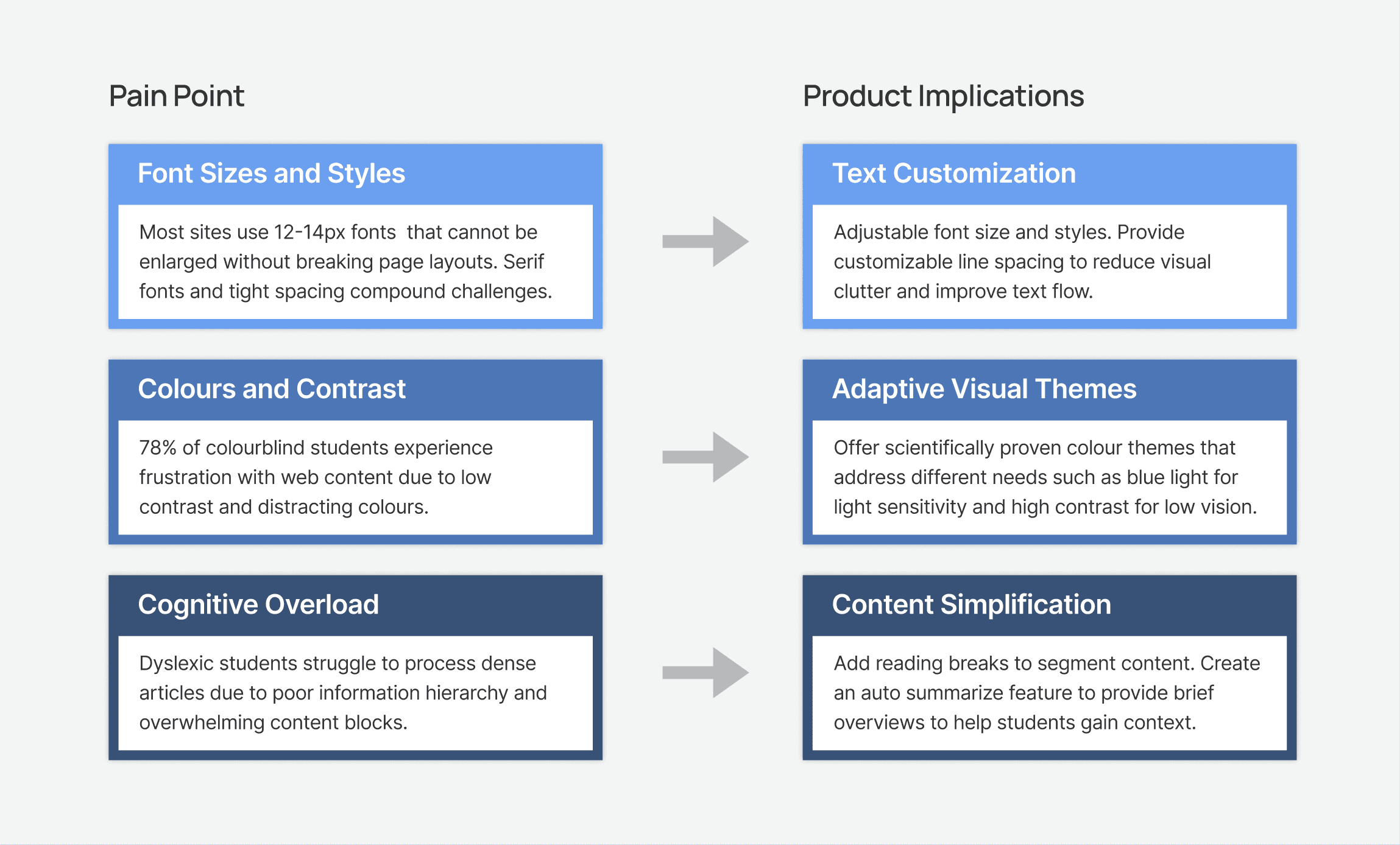 To assess the needs of visually impaired students, we conducted secondary research and analyzed existing accessibility solutions. Our findings revealed three overarching themes: