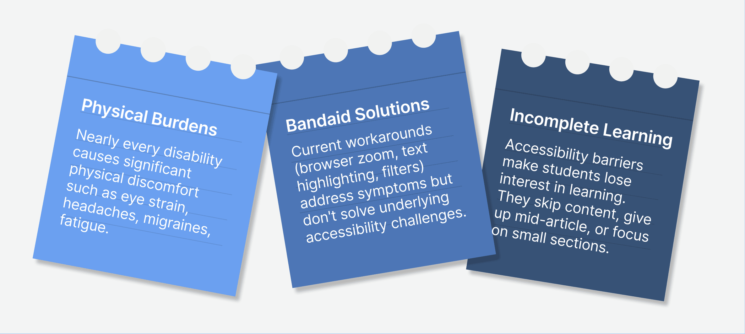 The internet serves as the primary resource for research and reading, yet most websites don't account for diverse visual needs. The very technology meant to democratize education has instead created new forms of exclusion, leaving millions of children behind.